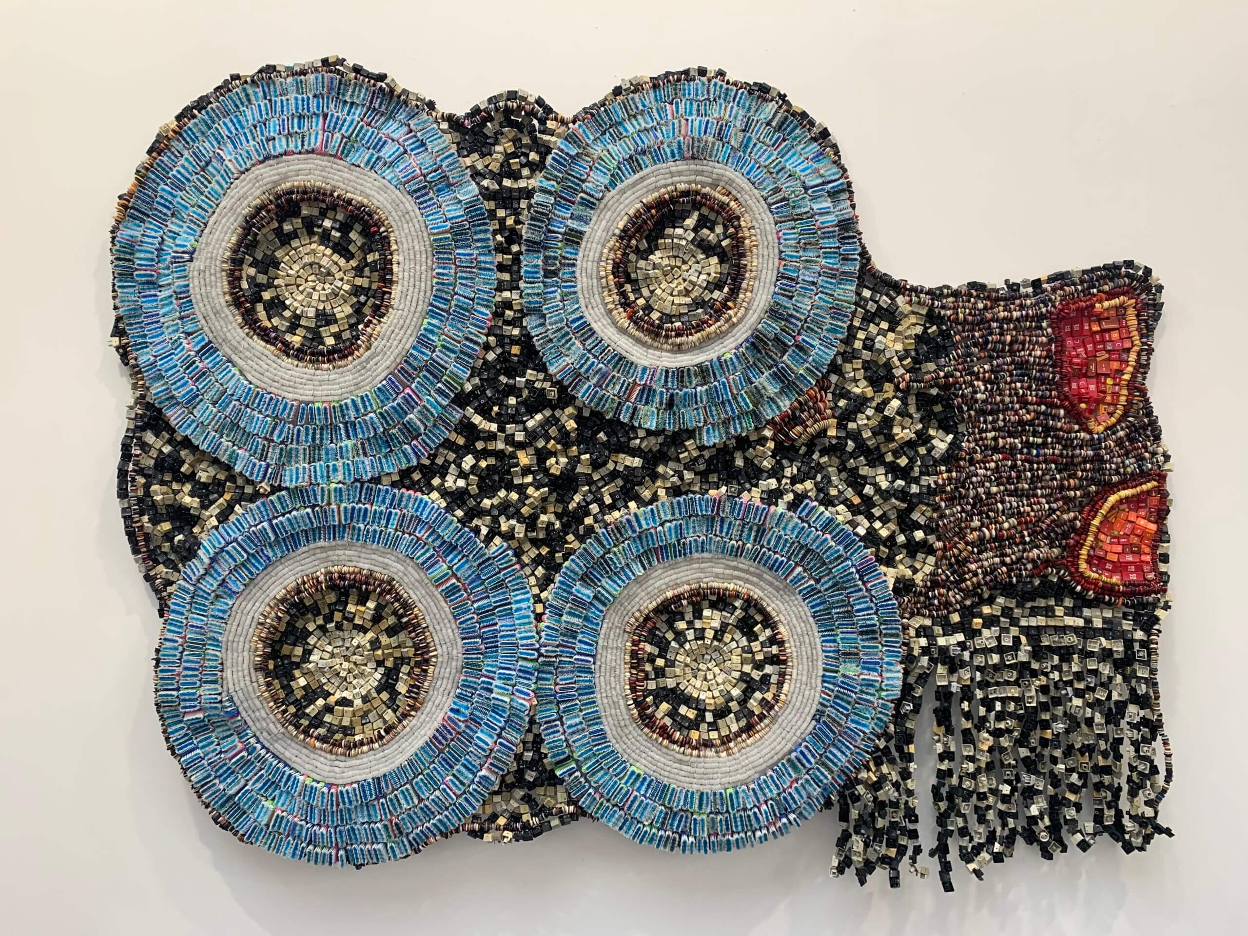 - Clean teeth, 2025, de Moffat Takadiwa, assemblage de têtes de brosse à dent, touches de clavier d’ordinateur, bouchons de tube de dentifrice et boutons de vêtement en métal, 140 x 188 x 10 cm .