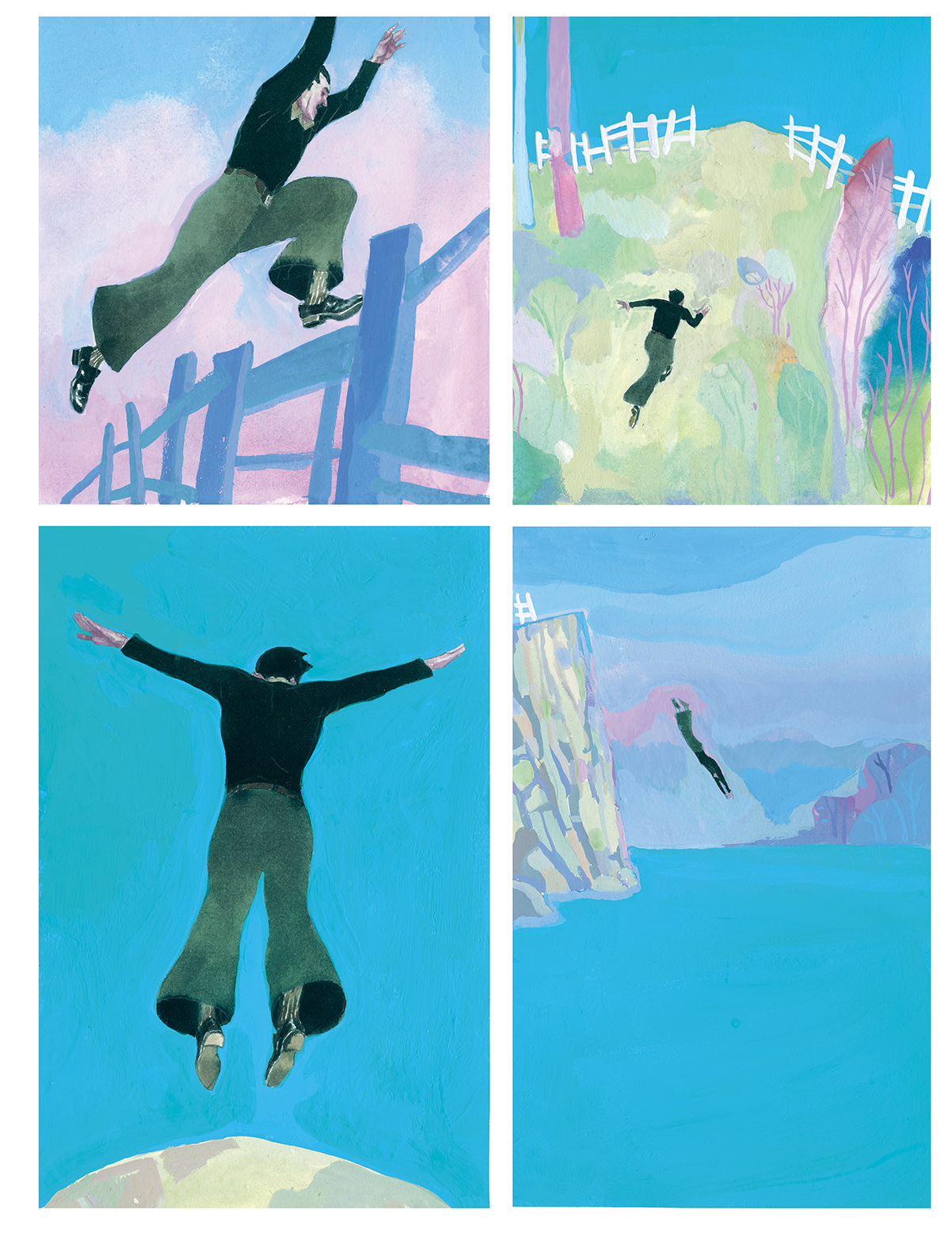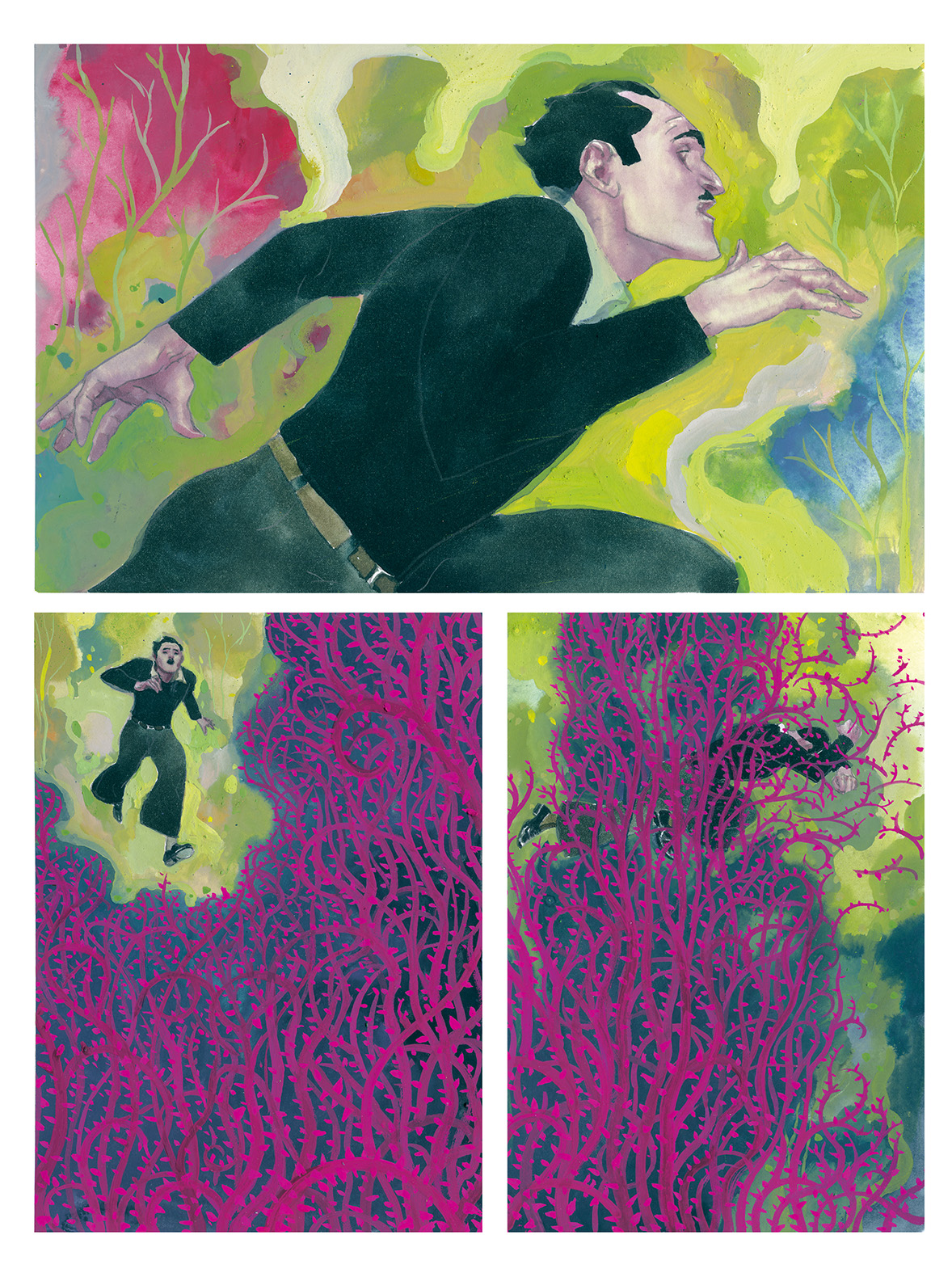 Colours give rhythm to the stories of these two heroes. The scene in which his paternal grandfather manages to escape from the SS is a frantic race that begins in the green of the forest, then the red of the brambles and ends, with the page just turned, with a slap of blue, the blue of freedom !