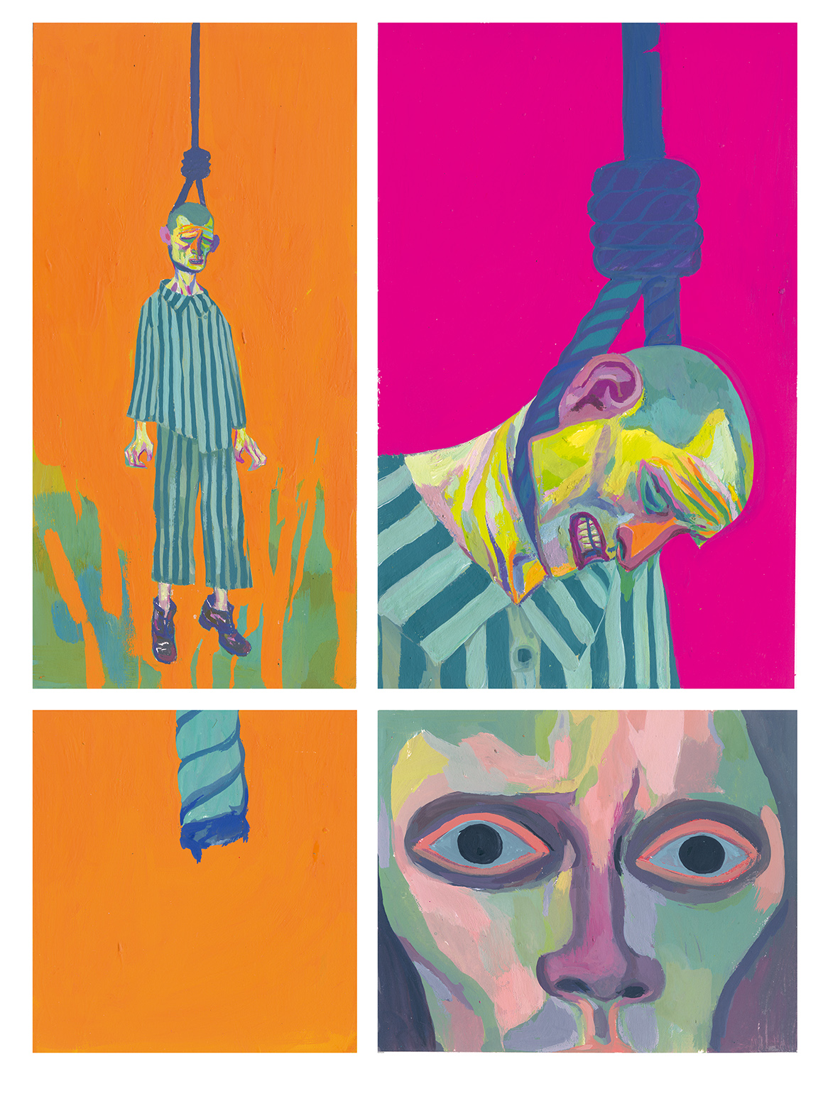 Is yellow not the colour of life and light ? David Sala uses it for the floor of a hanging scene of his maternal grandfather or for his face grimacing with pain.